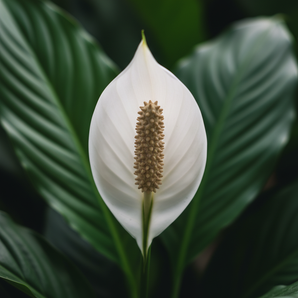 - Flores brancas compostas por uma espata (a “pétala” branca) e um espádice central (espiguinha amarelada);