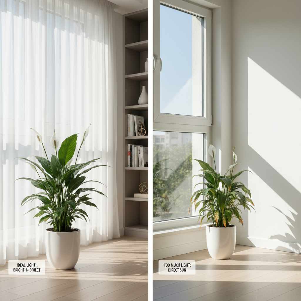 O lírio da paz aprecia umidade ambiente um pouco mais alta, especialmente em locais com ar-condicionado ou clima muito seco.
